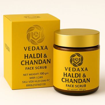 Vedaxa Haldi & Chandan Face Scrub is a gentle yet effective herbal exfoliator enriched with Turmeric (Haldi), Sandalwood (Chandan), Aloe Vera, and Vitamin E. It removes dead skin cells, excess oil, and impurities while soothing the skin. Regular use helps brighten complexion, reduce blemishes, and leave skin smooth, calm, refreshed, and naturally glowing.